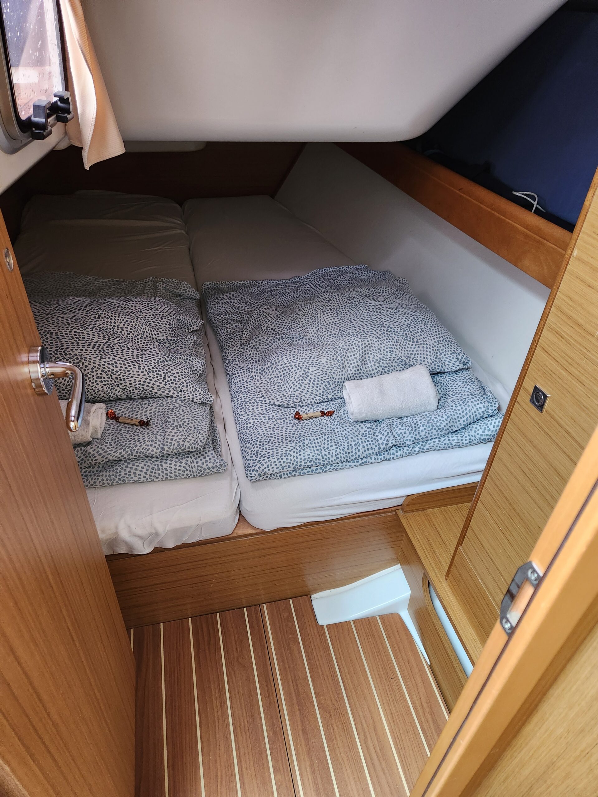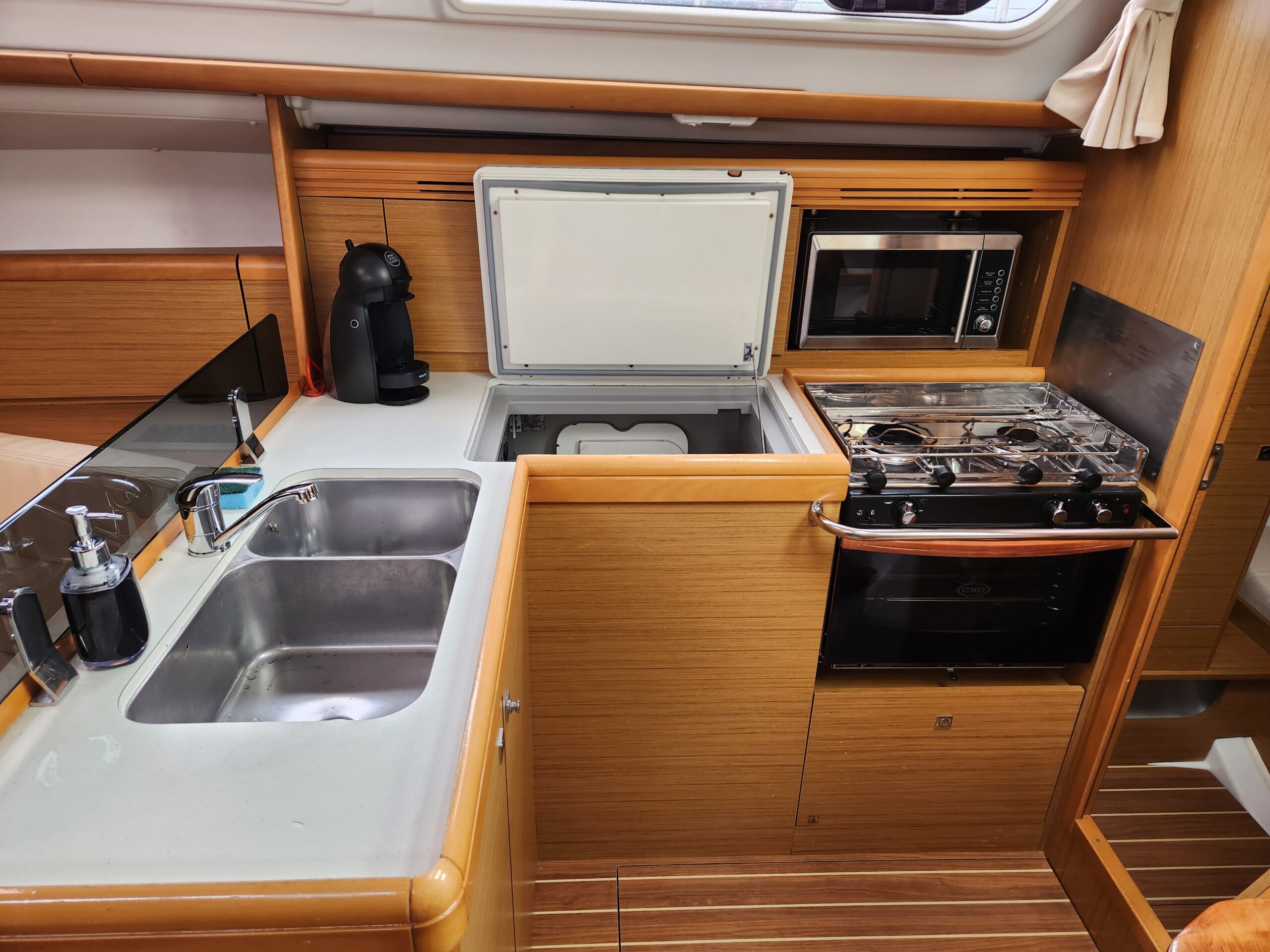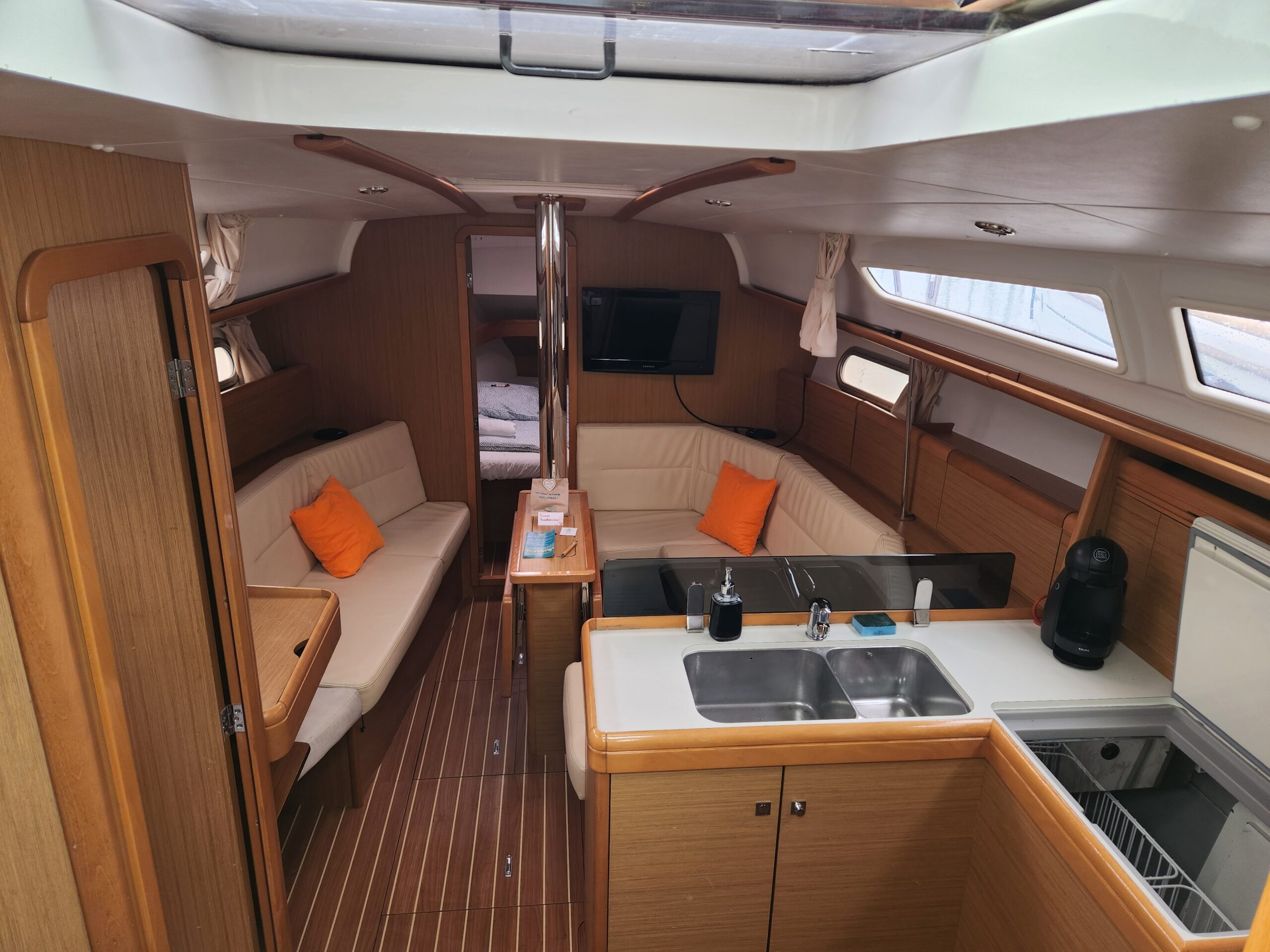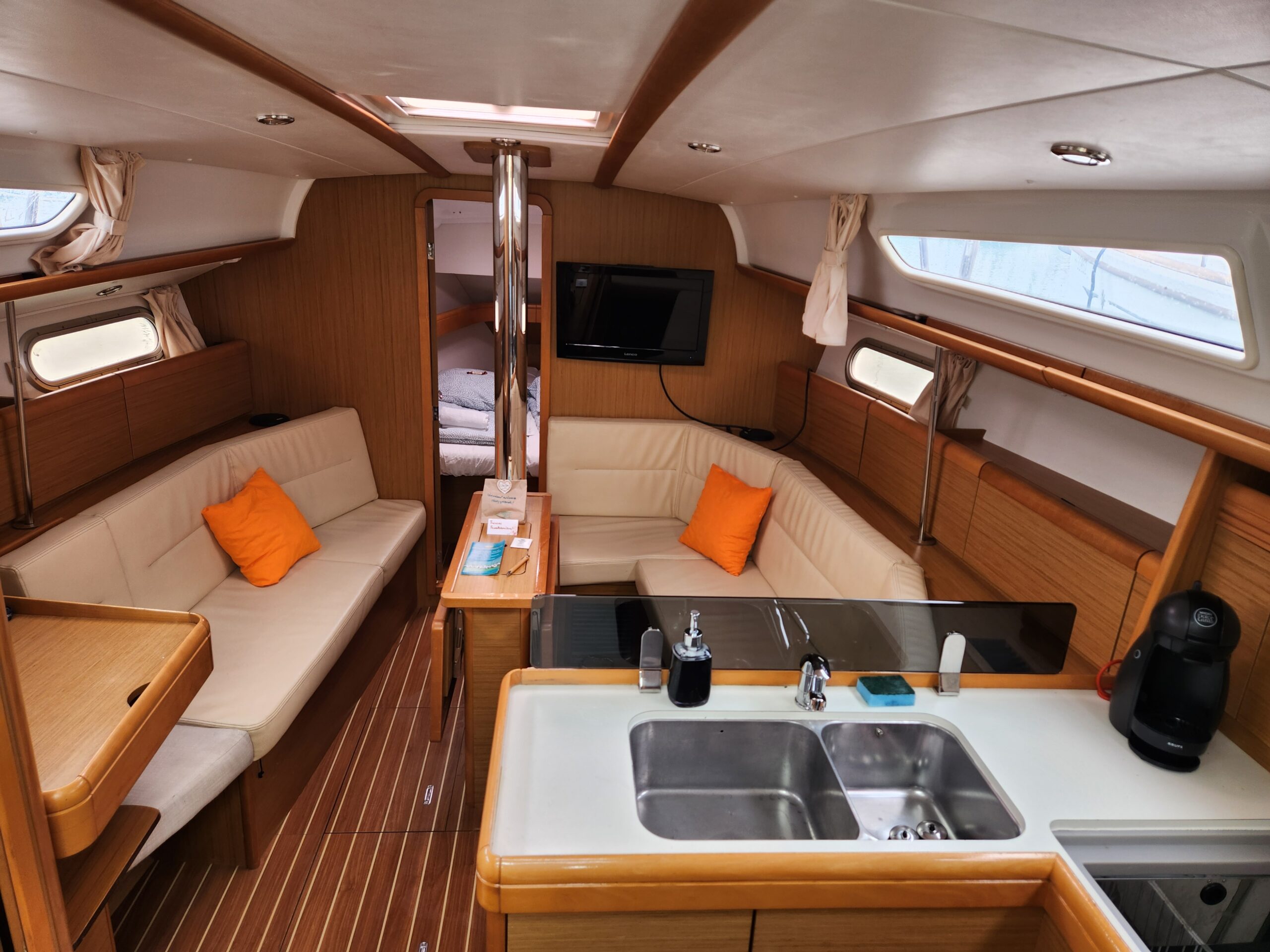 Stretch out on the sunbathing cushions in the cockpit or on the deck. Step inside the air-conditioned cabin, enjoy your favorite movies on the LCD TV and DVD player, or prepare a snack using the microwave. Start your day with a rich coffee from the Dolce Gusto machine while admiring the water view. King David also features a bow thruster and roll sails, making sailing smooth and easy in any conditions. You can book the boat for a short cruise or plan a multi-day adventure.